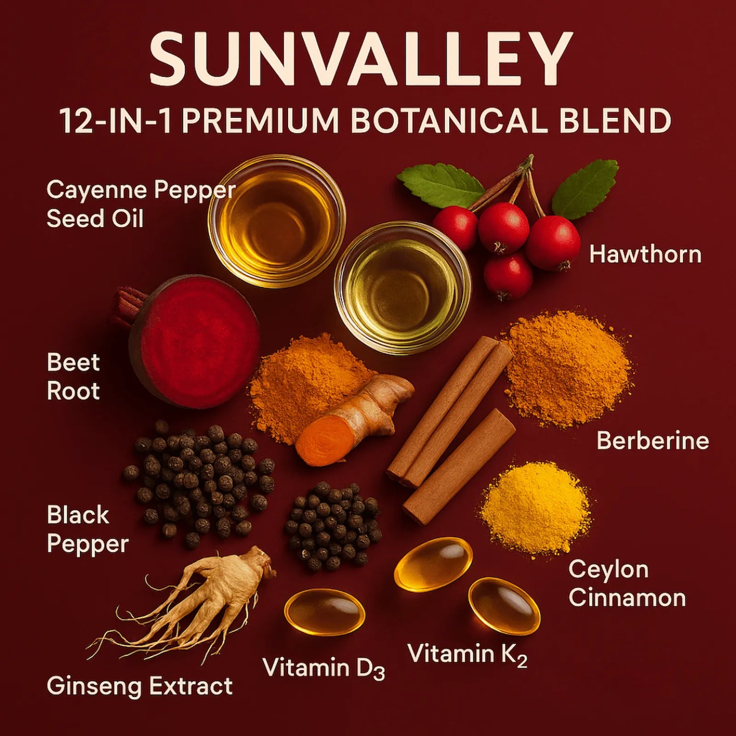 We understand the skepticism. Most supplements are underdosed with proprietary blends that hide how little active ingredient they actually contain. Sunvalley™ is different: we use a premium 12-in-1 botanical blend with 300mg cayenne pepper seed oil, 100mg grape seed oil, 50mg curcumin, plus hawthorn berry, beet root, cinnamon, berberine, ginseng, and essential vitamins D3, K2, and E. These are research-backed ingredients in effective doses, not marketing hype. We target the root cause (restricted blood flow and arterial plaque) instead of just masking symptoms. This is why customers see measurable improvements in BP, performance, and energy, because we're giving your body what it actually needs to heal, in amounts that actually work.